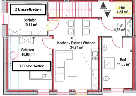 Getrennt schlafen: Mit 2 separaten Schlafzimmern (plus Schlafmöglichkeit im Wohnbereich) können hier bis zu 6 Personen unterkommen, wobei die Aufteilung ideal für 2-3 Kollegen ist, die jeweils ihr eigenes Reich haben möchten.