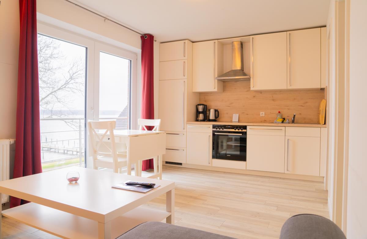 Wohnen mit Aussicht: Der kombinierte Wohn- und Essraum ist das Herzstück der Wohnung. Genießen Sie den direkten Blick auf die Schlei und das maritime Treiben der Segelboote. Der Bereich ist mit einem Flachbild-TV, kostenlosem WLAN und einer zusätzlichen Schlafmöglichkeit ausgestattet.