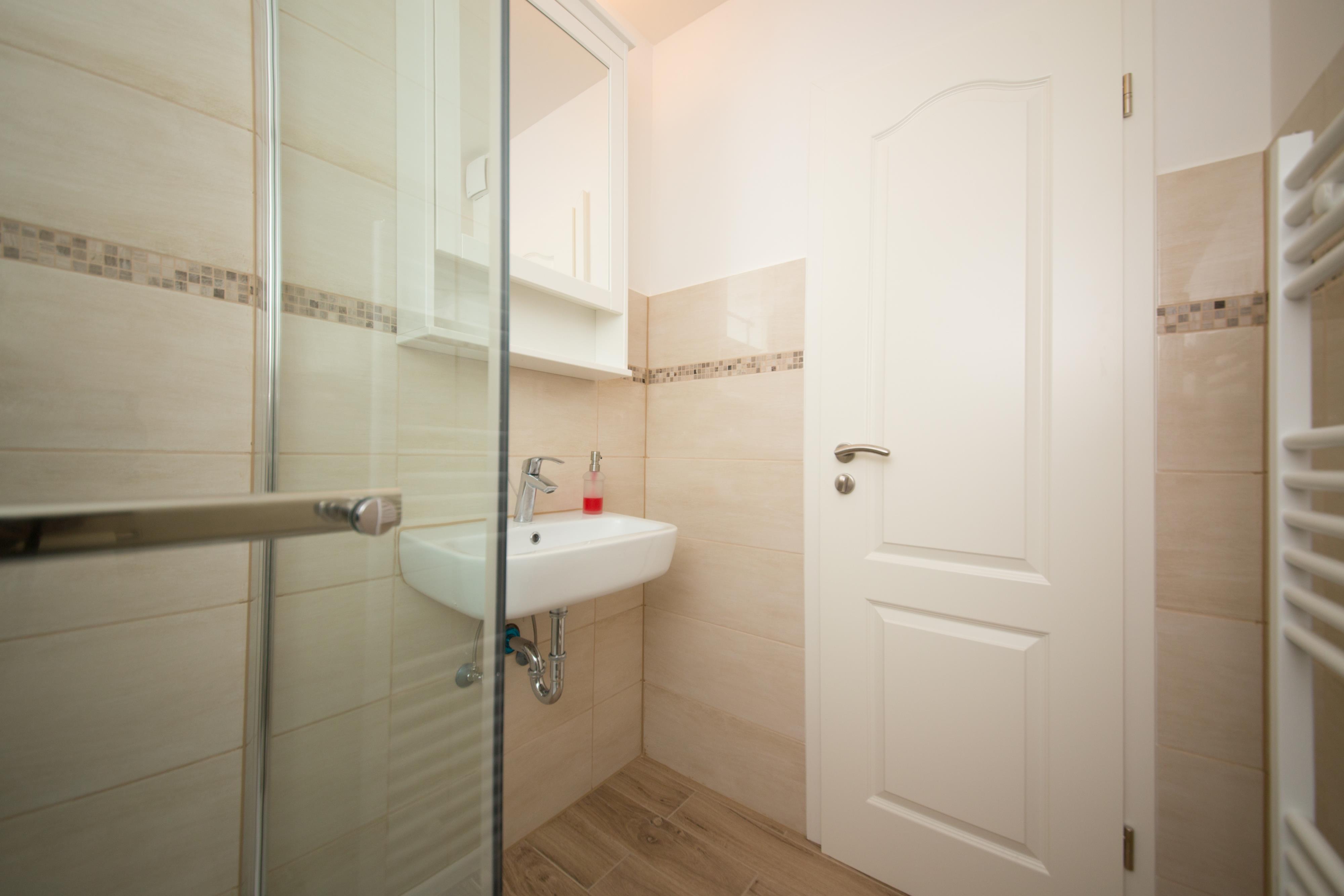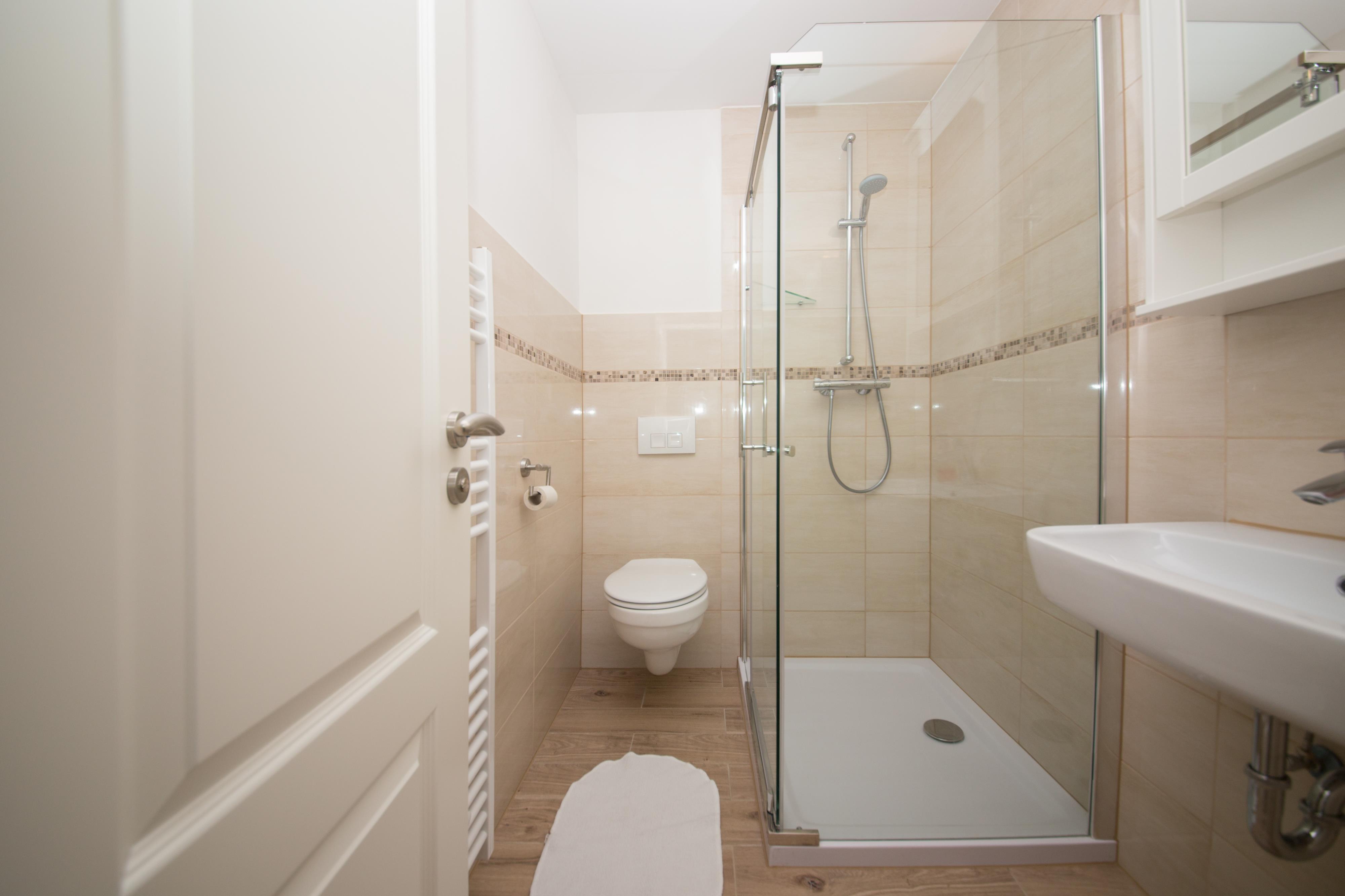 Badezimmer: Ein modernes, helles Duschbad.