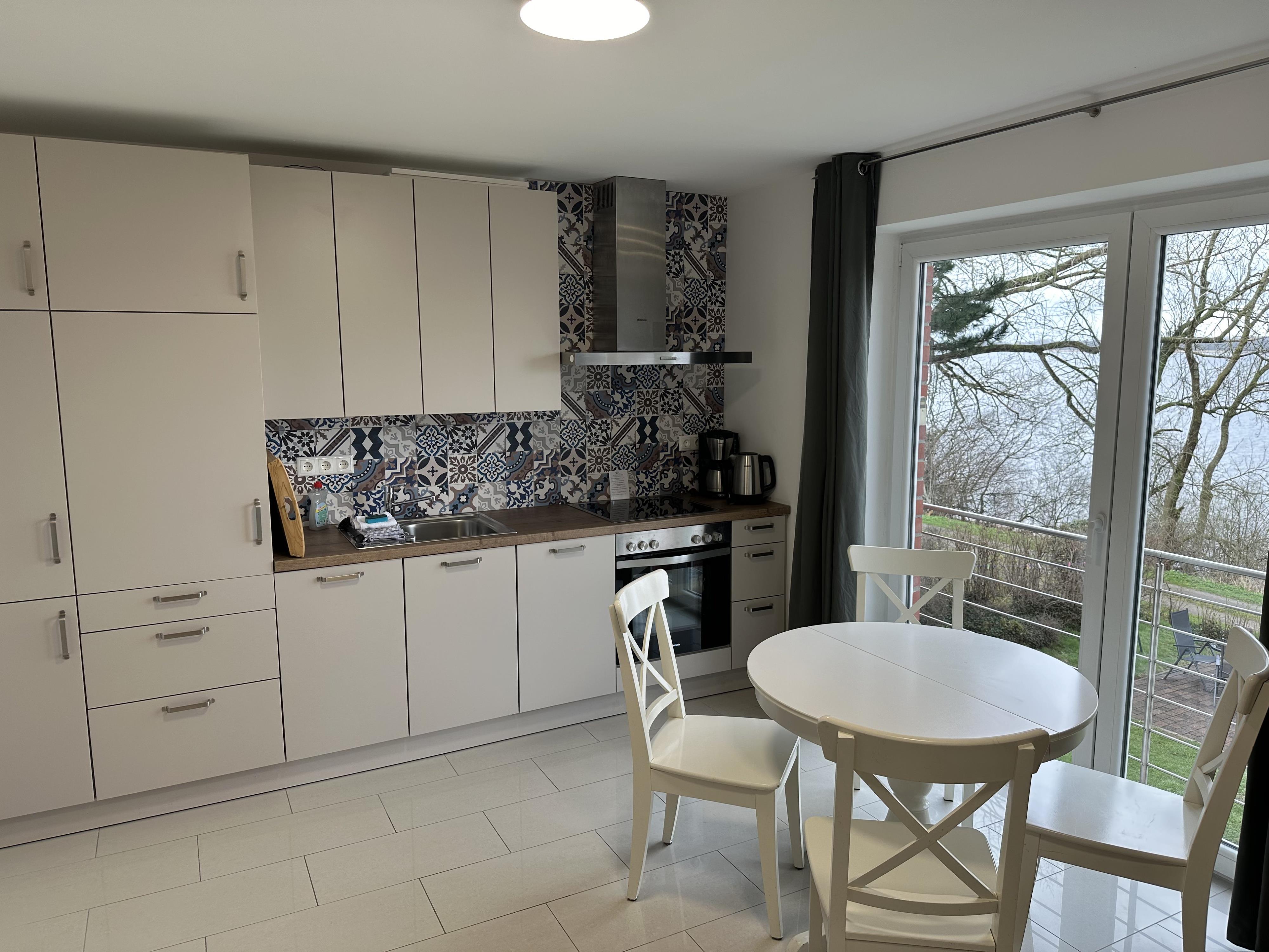 Moderne Einbauküche: Die offene Küche ist voll ausgestattet für anspruchsvolle Selbstversorger. Sie verfügt über einen E-Herd, Backofen und – für maximalen Komfort – einen praktischen Geschirrspüler. Kühlschrank mit Gefrierfach, Kaffeemaschine, Toaster und Wasserkocher sind ebenfalls vorhanden.